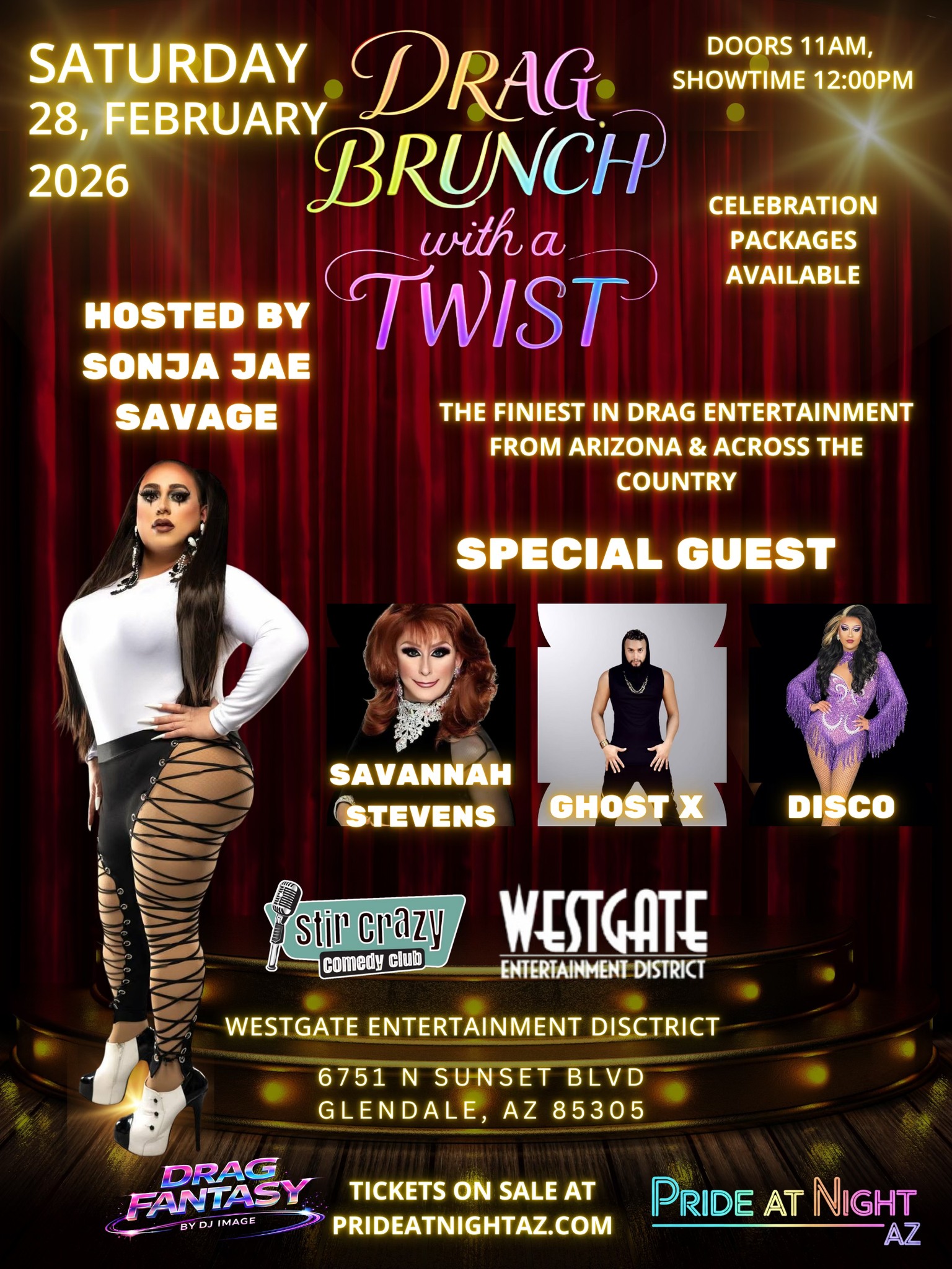Join us for Drag Brunch with a Twist hosted by Sonja Jae Savage with special guests Savannah Stevens, Ghost X (Michael Angelo), and Disco. Enjoy brunch and high-energy drag performances. Doors open at 11:00 AM and the show begins at 12:00 PM at Stir Crazy Comedy Club in the Westgate Entertainment District. Celebration packages are available. Presented by Pride at Night AZ & Drag Fantasy.